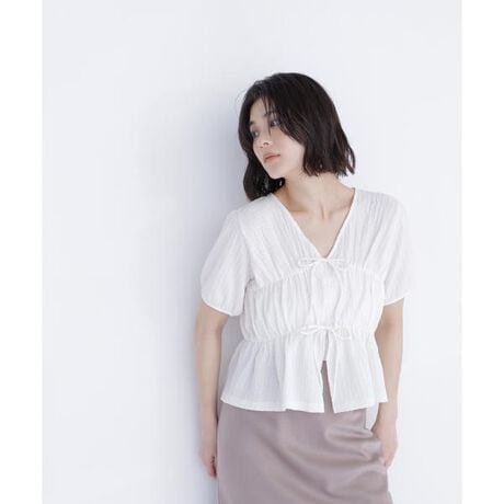 ポコポコとした凹凸感のある素材を使用した、ブラウスライクなカットソープルオーバー。カットソー素材とゴム仕様でリラクシーな着心地です。フロントのダブルリボンがポイントで、アウターを羽織った時も華やかに見せてくれます。<素材>ポコポコとした凹凸感のあるシュリンクカットソー素材を使用しています。<詳細>仕様・開閉なし裏地・なし透け感・ややあり / 光沢・なし / 伸縮性・あり生地の厚さ・薄手※モデルの着用画像の場合、光の当たり具合により、実際の色味と異なって見えることがございます。色味は、商品単体の画像をご参照ください。