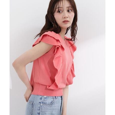 ラッフルスリーブがポイントのニットトップス。シンプルながらもフェミニンな印象をプラスしてくれるデザインです。程よいボリュームのラッフルが腕をすっきり見せながら、デイリーに活躍。鮮やかなカラーも揃えており、夏のコーディネートに映える一枚です。