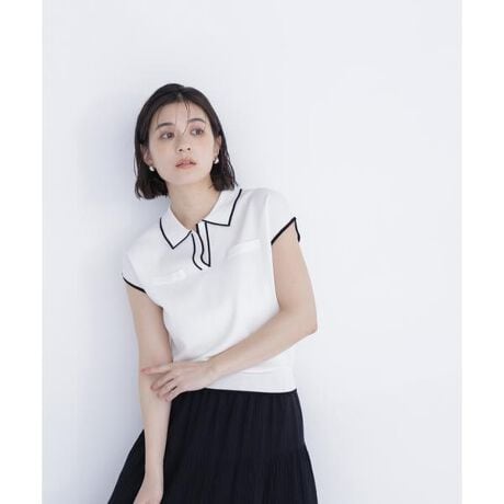 スキッパー襟にバイカラーを効かせたニットプルオーバー。フレンチスリーブとスキッパーの首元で抜け感を演出し、気になる二の腕をカバーします。胸元の箱ポケットがアクセントになり、スカートにもパンツにも合わせやすい一枚です。<素材>ドライタッチのキレイな目面の糸を総針編みで編み立てています。<詳細>仕様・開閉なし裏地・なし透け感・なし / 光沢・なし / 伸縮性・あり生地の厚さ・普通※モデルの着用画像の場合、光の当たり具合により、実際の色味と異なって見えることがございます。色味は、商品単体の画像をご参照ください。