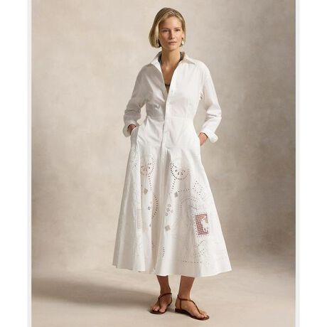 繊細なアイレット刺繍でスカートにディテールを添えたコットンシャツドレス。パネル構造のデザインを取り入れて、ロマンティックなAラインのシルエットを演出。・Aラインのシルエット / ミッドカーフ丈・ポインテッドカラー / ボタン付き前立て / シェルボタン・長袖、ボタン付きバレルカフス / ウエストにサイドシームポケット・ウエストにヨーク / ウエストの前後にダーツ / バックヨーク / 裏地なし・モデル身長178cm、着用サイズ4 【素材】・本体:綿 100% 刺繍糸:ポリエステル 100%【生産国】インド