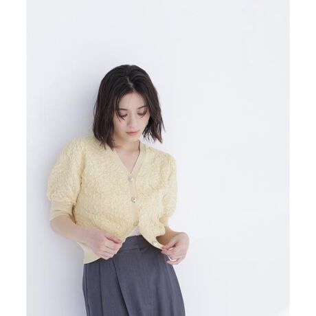 立体感のある膨れジャガード編みが目を引くニットカーディガン。エンブレム釦がアクセントになり、クラシカルな雰囲気に見せてくれます。コンパクトなシルエットでバランス良く着こなせ、パフスリーブが腕をすっきり見せてくれるのも嬉しいポイントです。<素材>ふくれジャガード編みのニット素材を使用。柔らかく程よい厚みで快適な着心地です。<詳細>仕様・前ボタン裏地・なし透け感・なし / 光沢・なし / 伸縮性・あり生地の厚さ・普通※モデルの着用画像の場合、光の当たり具合により、実際の色味と異なって見えることがございます。色味は、商品単体の画像をご参照ください。