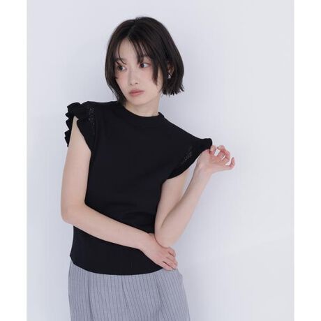 肩とネックのアイレットが涼しげなニット。片畦フリルで立体感と華やかさをプラスし、肩にかかるスリーブ丈で二の腕をすっきり見せてくれます。身頃はすっきりシルエットなので、キレイめスカートとのコーディネートがおすすめです。<素材>さらっとドライタッチな素材を使用。身頃はリブ編みです。<詳細>仕様・開閉なし裏地・なし透け感・ややあり / 光沢・なし / 伸縮性・あり生地の厚さ・普通※モデルの着用画像の場合、光の当たり具合により、実際の色味と異なって見えることがございます。色味は、商品単体の画像をご参照ください。