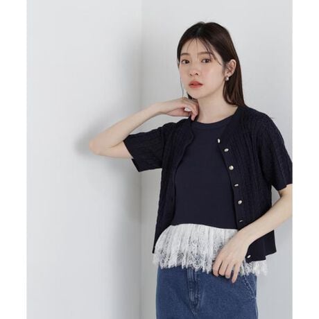 裾にあしらった2段のレースが目を引くタンクトップ。身頃には伸縮性のあるテレコ素材を使用しており、程よくフィットする着心地です。縦ラインを強調するリブ感で、すっきりとした印象を演出。カーディガンやジャケットはもちろん、シアーパーカー(ブランド品番121-6176500)を羽織るコーディネートがイチオシです。