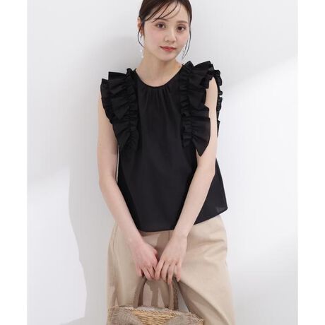 袖まわりのボリュームラッフルが目を引くブラウス。ハリのある素材を使用し、2枚仕立てのラッフルで華やかな印象に仕上げています。コーディネートの主役になるデザインで、スカートはもちろん、デニムと合わせたカジュアルスタイルもおすすめです。