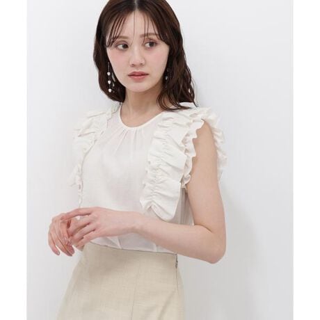 袖まわりのボリュームラッフルが目を引くブラウス。ハリのある素材を使用し、2枚仕立てのラッフルで華やかな印象に仕上げています。コーディネートの主役になるデザインで、スカートはもちろん、デニムと合わせたカジュアルスタイルもおすすめです。