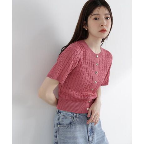 重たく見せない絶妙なショート丈に仕上げたケーブルニット。フロントのメタル釦がアクセントになり、シンプルながら目を引くデザインです。スカートやワイドパンツとも相性バツグンで、バランス良く着こなせて脚長効果も期待。今季はトップス風に着こなすのがおすすめです。