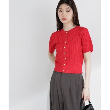 重たく見せない絶妙なショート丈に仕上げたケーブルニット。フロントのメタル釦がアクセントになり、シンプルながら目を引くデザインです。スカートやワイドパンツとも相性バツグンで、バランス良く着こなせて脚長効果も期待。今季はトップス風に着こなすのがおすすめです。