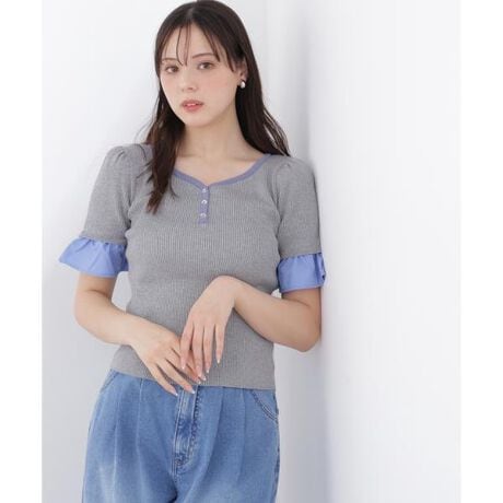 人気アイテムが半袖になって登場!トレンドの異素材ドッキングニット。フレアカフスがレイヤード風に見えるデザインで、バイカラーがアクセントになった一枚。ハートネックとフロント釦もポイントです。デニムパンツと合わせた、フェミニンカジュアルな着こなしにもおすすめです。