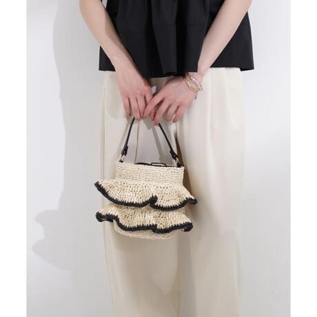 配色フリルが目を引くバケットバッグ。小ぶりながら必要な持ち物が収納でき、巾着仕様の口元が中身をカバーします。取り外しできるショルダー付き。アクセサリー感覚で取り入れられるアイテムです。