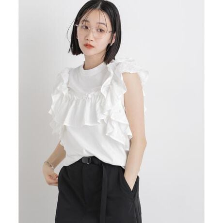 大胆なデザインフリルが目を引くカットトップス。布帛部分を肩上にかけたり、オフショルダーにしたり、脇下に持ってきたりと、3wayの着こなしを楽しめます。