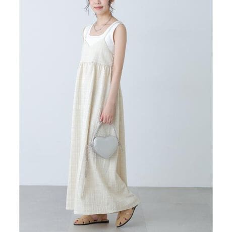 格子柄風の表情が特徴的な、ふくれジャガード素材のキャミワンピース。立体感のある生地がシンプルながらも存在感を演出し、1枚で着映えるデザイン。胸下で切り替えたやや高めのウエスト位置がスタイルアップを叶え、裾に向かって広がるフレアシルエットが女性らしい印象に。華奢なストラップで抜け感をプラスし、インナー次第でロングシーズン着回せます。シアートップスやコンパクトロゴTを合わせるだけで旬なスタイリングが完成。シンプルなインナーに、シャツやジャケットを羽織ればきちんと感のあるスタイルも楽しめます。※モデルの着用画像の場合、光の当たり具合により、実際の色味と異なって見えることがございます。色味は、商品単体の画像をご参照ください。