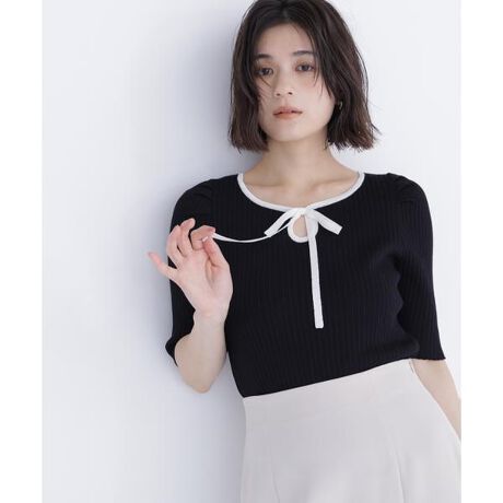 襟ぐりのパイピングからつながるセンターリボンがポイントのニット。袖山のタックで程よくボリュームを持たせ、シンプルながら華やかな印象のデザインです。夏らしいボーダー柄と配色使いの無地を揃えています。<素材>シャリ感のある春夏に着やすいすっきりとした糸を使用しています。<詳細>仕様・開閉なし裏地・なし透け感・なし / 光沢・なし / 伸縮性・あり生地の厚さ・普通 ※モデルの着用画像の場合、光の当たり具合により、実際の色味と異なって見えることがございます。色味は、商品単体の画像をご参照ください。