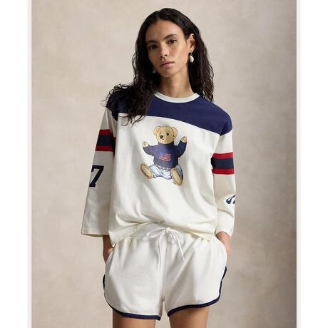 スポーティなジャージー風デザインが特徴の柔らかなコットンTシャツ。オーバーサイズのシルエットとブレスレットレングスの袖が特徴。1992年に登場したアイコニックなシッティングベアのプリントをフロントにあしらい、Ralph Laurenの創業年を示す両袖の67でアクセントをプラスしたアイテム。・わずかにオーバーサイズのゆったりとしたフィット / 腰丈・クルーネック / コントラストの効いたシーム入りヨーク・ブレスレットレングスの長袖 / ドロップショルダー / 両袖にストライプのトリムと67のプリント・フロント中央にPoloベアのプリント・モデル身長178cm、着用サイズS 【素材】・本体:綿 100%【生産国】インド