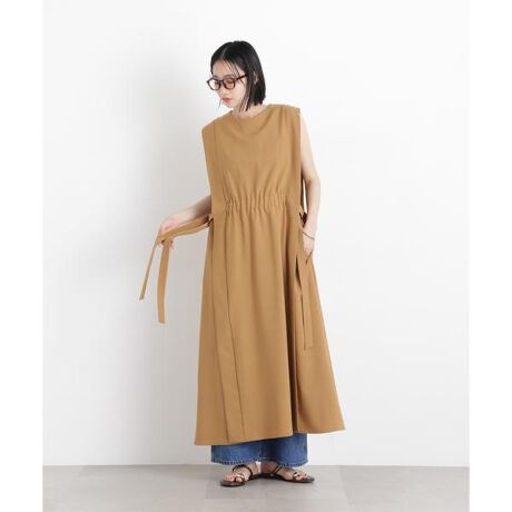 リラックス感あるシンプルなノースリーブワンピースにサイドリボンをあしらった一品。肩を華奢に見せてくれるタックデザインとサイドリボンのアレンジで、一枚でしっかりとスタイリングが決まります。