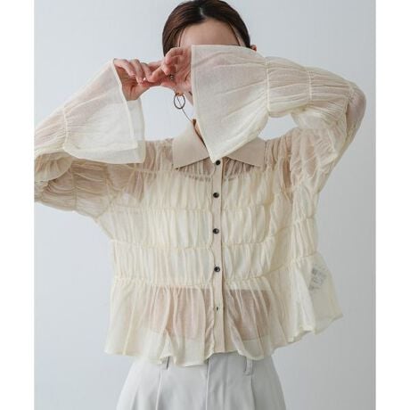 ・衿元と胸元に施されたたっぷりとしたシャーリングが今季らしいアクセント