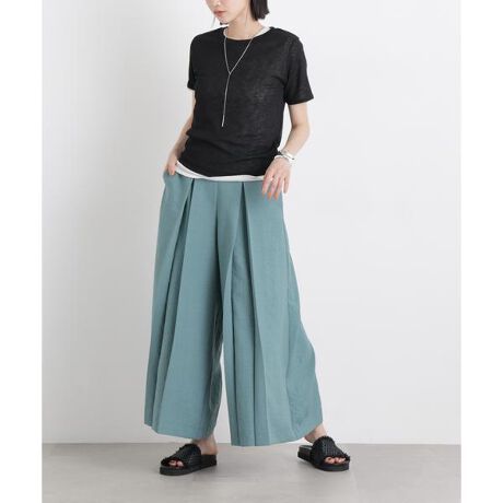 ワイドなシルエットとボックスプリーツが印象的な、存在感のあるワイドパンツ。たっぷりとした分量感で、まるでスカートのような軽やかな履き心地と、美しいシルエットを叶えてくれる一枚。シャリッとしたドライタッチで通気性も良く、汗ばむ季節でも快適に過ごせるアイテムです。