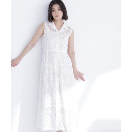繊細なレース素材が華やかなノースリーブワンピース。フロントを開けてロングジレとしても着用できる2way仕様です。共地のウエストベルト付きでシルエットの調整が可能。縦ラインを強調したすっきりとしたシルエットで、上品な印象に見せてくれます。<素材>コットンタッチなレースを使用しています。<詳細>仕様・前ボタン裏地・アンダードレスあり透け感・なし / 光沢・なし / 伸縮性・ややあり生地の厚さ・普通 ※モデルの着用画像の場合、光の当たり具合により、実際の色味と異なって見えることがございます。色味は、商品単体の画像をご参照ください。