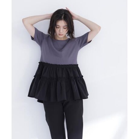 Tシャツボディに布帛のティアードをドッキングした異素材コンビトップス。裾に向かって広がるティアード切り替えで、軽やかなシルエットを演出します。配色ステッチがさりげないアクセントになり、身頃はカットソー素材で着心地が良いです。<素材>表面が整った天竺カットソーを使用しています。<詳細>仕様・開閉なし裏地・なし透け感・なし / 光沢・なし / 伸縮性・あり生地の厚さ・普通※モデルの着用画像の場合、光の当たり具合により、実際の色味と異なって見えることがございます。色味は、商品単体の画像をご参照ください。