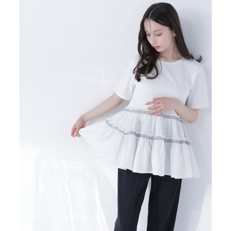 Tシャツボディに布帛のティアードをドッキングした異素材コンビトップス。裾に向かって広がるティアード切り替えで、軽やかなシルエットを演出します。配色ステッチがさりげないアクセントになり、身頃はカットソー素材で着心地が良いです。<素材>表面が整った天竺カットソーを使用しています。<詳細>仕様・開閉なし裏地・なし透け感・なし / 光沢・なし / 伸縮性・あり生地の厚さ・普通※モデルの着用画像の場合、光の当たり具合により、実際の色味と異なって見えることがございます。色味は、商品単体の画像をご参照ください。