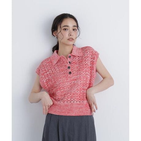 メランジ糸を使用した表情感のあるポロニット。すっきりと着られるノースリーブデザインで、軽やかな印象に見せてくれます。バイカラーのボタンがさりげないアクセントになり、シンプルながらも映える一枚。デイリーからキレイめスタイルまで幅広く活躍します。<素材>メランジ糸ならではの奥行きのあるニット素材を使用。さらっとした肌触りで、快適な着心地です。<詳細>仕様・前ボタン裏地・なし透け感・ややあり / 光沢・なし / 伸縮性・あり生地の厚さ・普通※モデルの着用画像の場合、光の当たり具合により、実際の色味と異なって見えることがございます。色味は、商品単体の画像をご参照ください。