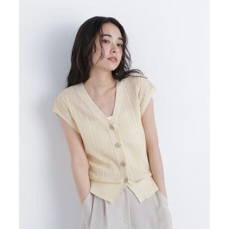スパンコールが煌めくシアーニットベスト。Vネックと縦編みで顔まわりをすっきり見せ、キャミソールと合わせればプルオーバー風の着こなしも出来ます。カラーごとに異なる釦がさりげないアクセント。黒は同色、イエローはベージュ、ブラウンは黒ボタンを付けています。<素材>細やかなスパンコール入りのシアー編地を使用しています。<詳細>仕様・前ボタン裏地・なし透け感・なし / 光沢・なし / 伸縮性・なし生地の厚さ・普通※モデルの着用画像の場合、光の当たり具合により、実際の色味と異なって見えることがございます。色味は、商品単体の画像をご参照ください。