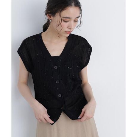 スパンコールが煌めくシアーニットベスト。Vネックと縦編みで顔まわりをすっきり見せ、キャミソールと合わせればプルオーバー風の着こなしも出来ます。カラーごとに異なる釦がさりげないアクセント。黒は同色、イエローはベージュ、ブラウンは黒ボタンを付けています。<素材>細やかなスパンコール入りのシアー編地を使用しています。<詳細>仕様・前ボタン裏地・なし透け感・なし / 光沢・なし / 伸縮性・なし生地の厚さ・普通※モデルの着用画像の場合、光の当たり具合により、実際の色味と異なって見えることがございます。色味は、商品単体の画像をご参照ください。