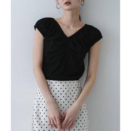 ・衿元と胸元に施されたたっぷりとしたギャザーが今季らしいアクセント