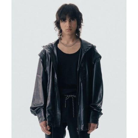 ライダースジャケットとフーディーを掛け合わせた一枚。