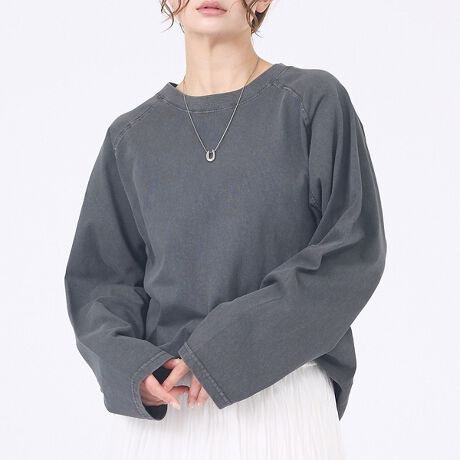 肩のラインを拾わないラグランスリーブと、ゆったりとしたボディシルエットの相乗効果で、着るだけで自然なこなれ感が生まれます。