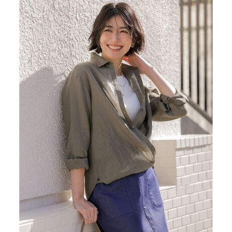 ■デザイン裾をクロスしてカシュクールにもアレンジできる2wayデザインのシャツ。背中にはギャザーを施し、動きやすさとリラックスしたシルエットをプラスしました。胸ポケットが程よいアクセントになりつつ、襟とカフスはシンプルなシャツ仕様できちんと感もキープ。さっと羽織るだけでこなれ感を演出する、大人のリラックスムード漂うアイテムです。カラーは、やわらかく女性らしい印象のピンク(#012)、大人っぽく上品なモカ(#030)、ナチュラルでやわらかい雰囲気のトップベージュ(#033)、涼し気で落ち着いた印象のダルブルー(#074)、きちんと感のあるネイビー(#075)の5色展開です。