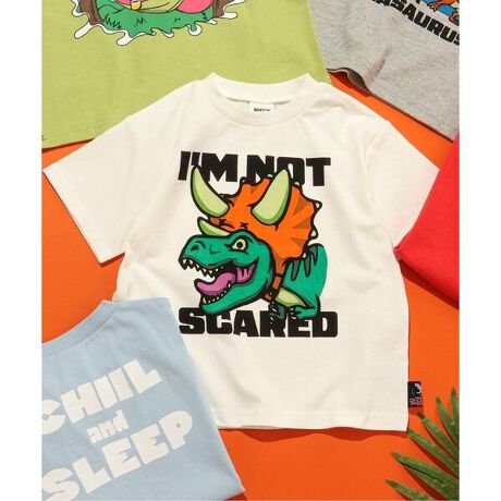 カラフルで表情豊かな恐竜たちが前にも後ろにもプリントされた、
