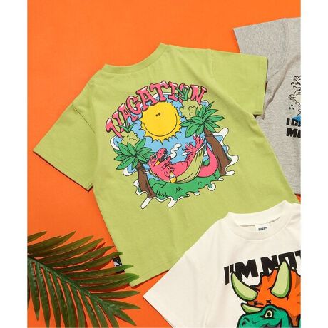 カラフルで表情豊かな恐竜たちが前にも後ろにもプリントされた、