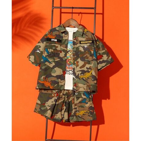 カモフラ柄の中に、恐竜たちがさりげなく差し色で散りばめられたデザインは、