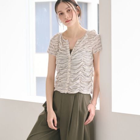 軽やかな素材にたっぷりとほどこしたシャーリングが立体感を生むトップス。