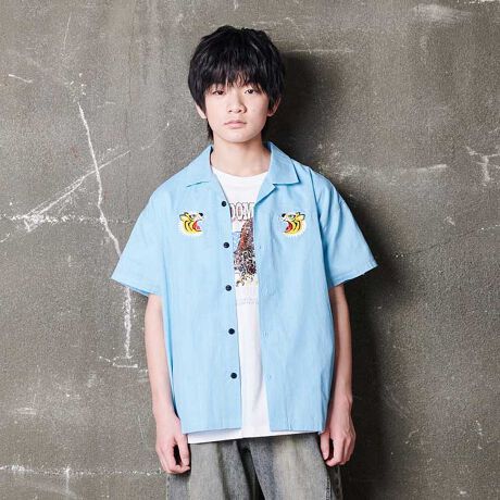 DaddyOhDaddyのアメカジテイストの120〜170cmのスクール、ジュニアアイテムライン。直営店では直営オンラインショップ「こどもの森e-shop」各店のみでの販売になります。【直営実店舗での販売はありません。】前にはトラの刺繍、後ろにもトラの刺繍がかっこいい!綿100%で夏のお出かけにオススメなスカシャツ。【アイテム】トップス カジュアル お洒落 オシャレ かっこいい かわいい 可愛い 普段着 デイリーウェア お出かけ着 お外着 お外遊び着 子ども服 こども服 男児 男の子 ボーイズ キッズ トドラーサイズ 幼稚園 保育園 小学校 通園 通学 小学生 2026年春夏物新作 丸高衣料 半袖 ジュニアサイズ スクールサイズ 男女兼用 ユニセックス 女児 女の子 ガールズ 中学校 中学生 高校生 修学旅行 林間学校 校外学習 遠足 ダディオダディ ブラック 黒色 ブルー 青色 サックス 水色 スカジャン コットン100% 綿100%