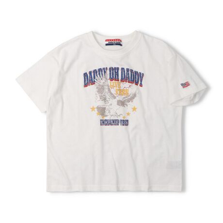 DaddyOhDaddyのアメカジテイストの120〜170cmのスクール、ジュニアアイテムライン。直営店では直営オンラインショップ「こどもの森e-shop」各店のみでの販売になります。【直営実店舗での販売はありません。】1000円(税抜)のプチプライスがうれしい、デイリー使いにオススメな半袖Tシャツ。ワシとロゴのかすれ、ひび割れプリントがアメカジテイストでかっこいい!【アイテム】トップス カジュアル お洒落 オシャレ かっこいい かわいい 可愛い 普段着 デイリーウェア お出かけ着 お外着 お外遊び着 子ども服 こども服 男児 男の子 ボーイズ キッズ トドラーサイズ 幼稚園 保育園 小学校 通園 通学 小学生 2026年春夏物新作 丸高衣料 半袖 ジュニアサイズ スクールサイズ 男女兼用 ユニセックス 女児 女の子 ガールズ 中学校 中学生 高校生 修学旅行 林間学校 校外学習 遠足 ダディオダディ スミブラック 黒色 オフホワイト 白色 パープル 紫色 わし 鷲 鳥