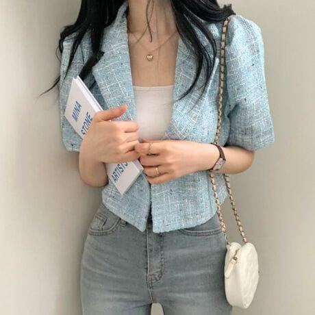 -ツイード素材が大人可愛い印象を与え、春夏のお出かけコーデにもぴったりの一枚です。