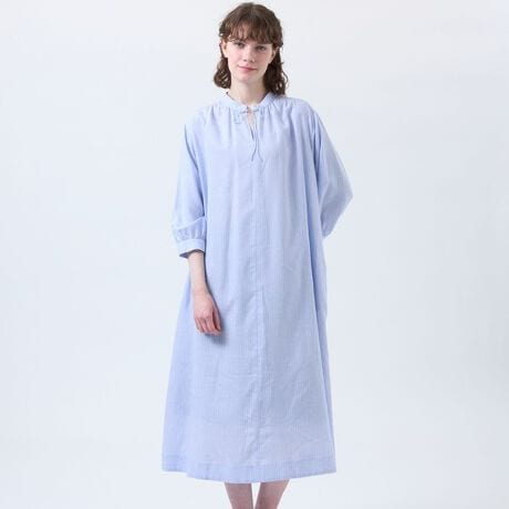 襟元の華奢なリボンがポイントになったバンドカラーサックドレス。たっぷりとした分量感で肌離れも良く、清涼感のある着心地です。コーディネートを考えずにさらっと涼しく一枚で決まる頼もしい一着。
