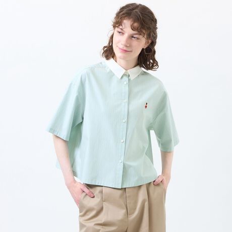 クリーンな印象のクレリックカラーがポイントになったレギュラーカラーブラウス。襟の詰まったレギュラーカラーで甘くなりすぎないデザインに仕上げました。前開きなので、羽織として着用できるのもうれしいポイント。