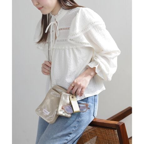 メタリックカラーが、コーデにアクセントを与えるネックポーチ。