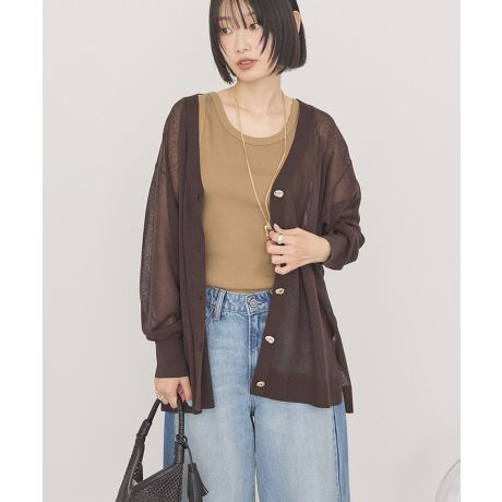 上品にきらめく、軽やかシアーカーディガン程よい透け感が魅力のシアー素材で、軽やかな着心地を叶えてくれる一枚です。さらりと羽織るだけで、抜け感のある大人カジュアルなスタイリングが完成します。Vネックデザインは顔まわりをすっきりと見せ、インナーとのレイヤードも楽しめるのがポイントです。さりげなく光るメタルボタンが上品なアクセントとなり、シンプルながらも洗練された印象に仕上がります。丈はやや長めでヒップラインをカバーし、体型カバーにも役立ちます。サイドスリット入りで動きやすく、ボトムを選ばず幅広いコーディネートに対応できる万能アイテムです。透け感[あり]