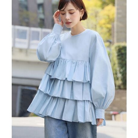 【綿100%使用】ボリューム袖3段フリルティアードブラウス