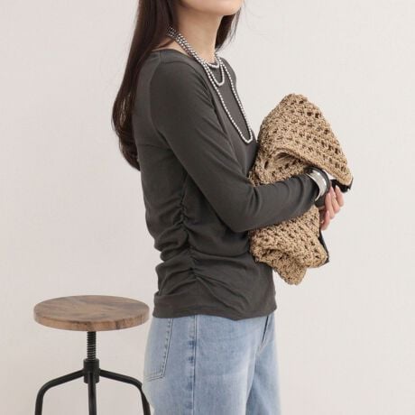 ・サイドに施したギャザーデザインがシンプルながらも着映えするポイント