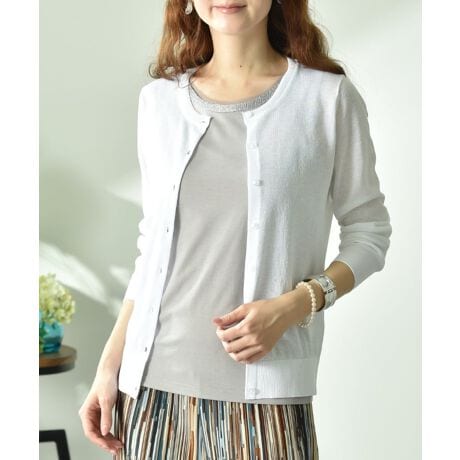 シンプルなカーディガンはオフィススタイルでも活躍間違いなし!またちょっとしたお出かけやお食事会などの羽織にもぴったり。上品なシアー感、釦は本体と同色で女性らしさをプラスした仕上がりになっています。また、ご自宅でイージーケア(手洗い)が出来るのも嬉しいポイントです。