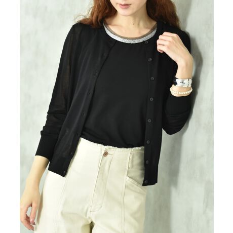 シンプルなカーディガンはオフィススタイルでも活躍間違いなし!またちょっとしたお出かけやお食事会などの羽織にもぴったり。上品なシアー感、釦は本体と同色で女性らしさをプラスした仕上がりになっています。また、ご自宅でイージーケア(手洗い)が出来るのも嬉しいポイントです。