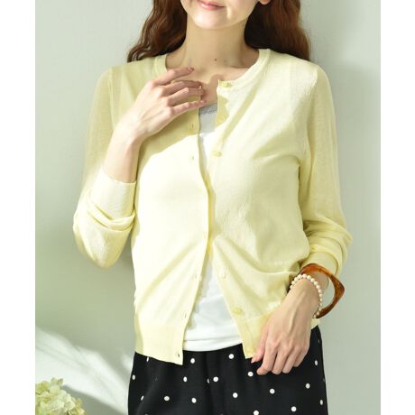 シンプルなカーディガンはオフィススタイルでも活躍間違いなし!またちょっとしたお出かけやお食事会などの羽織にもぴったり。上品なシアー感、釦は本体と同色で女性らしさをプラスした仕上がりになっています。また、ご自宅でイージーケア(手洗い)が出来るのも嬉しいポイントです。