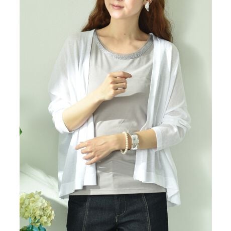 抗ピル・UV・接触冷感・手洗い可能とこれから夏に向けて活躍する素材を使用したシンプルトッパーカーディガン。すっきりしたシルエットながら柔らかな素材を使用しているため動きやすく、気になる腕回りもラクに着回せます。無駄のないデザインが着回しに重宝するお勧めな1枚です。