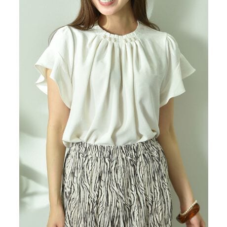 【UV・接触冷感】ポーラ袖ミニパールデザイン袖フリル半袖ブラウス