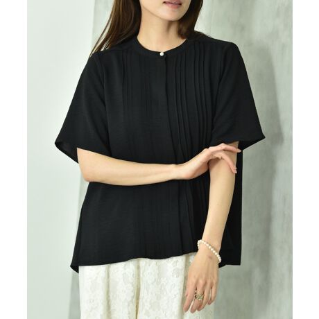 これからのシーズンに嬉しいメリット付きで、肌触りの良いポリエステル生地を使用。フロントにさりげなくパール釦をあしらい、上品なピンタックデザインが目を惹くブラウス。ネックレスなどアクセサリーが無くても顔回りを華やかに演出してくれます。身体から程よく離れるサイジングで体型カバーにもなり、シワになりにくく透け感の少ない素材なのもおススメなポイント。