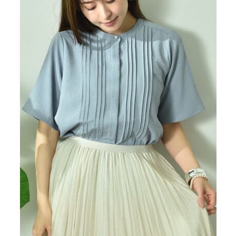 これからのシーズンに嬉しいメリット付きで、肌触りの良いポリエステル生地を使用。フロントにさりげなくパール釦をあしらい、上品なピンタックデザインが目を惹くブラウス。ネックレスなどアクセサリーが無くても顔回りを華やかに演出してくれます。身体から程よく離れるサイジングで体型カバーにもなり、シワになりにくく透け感の少ない素材なのもおススメなポイント。